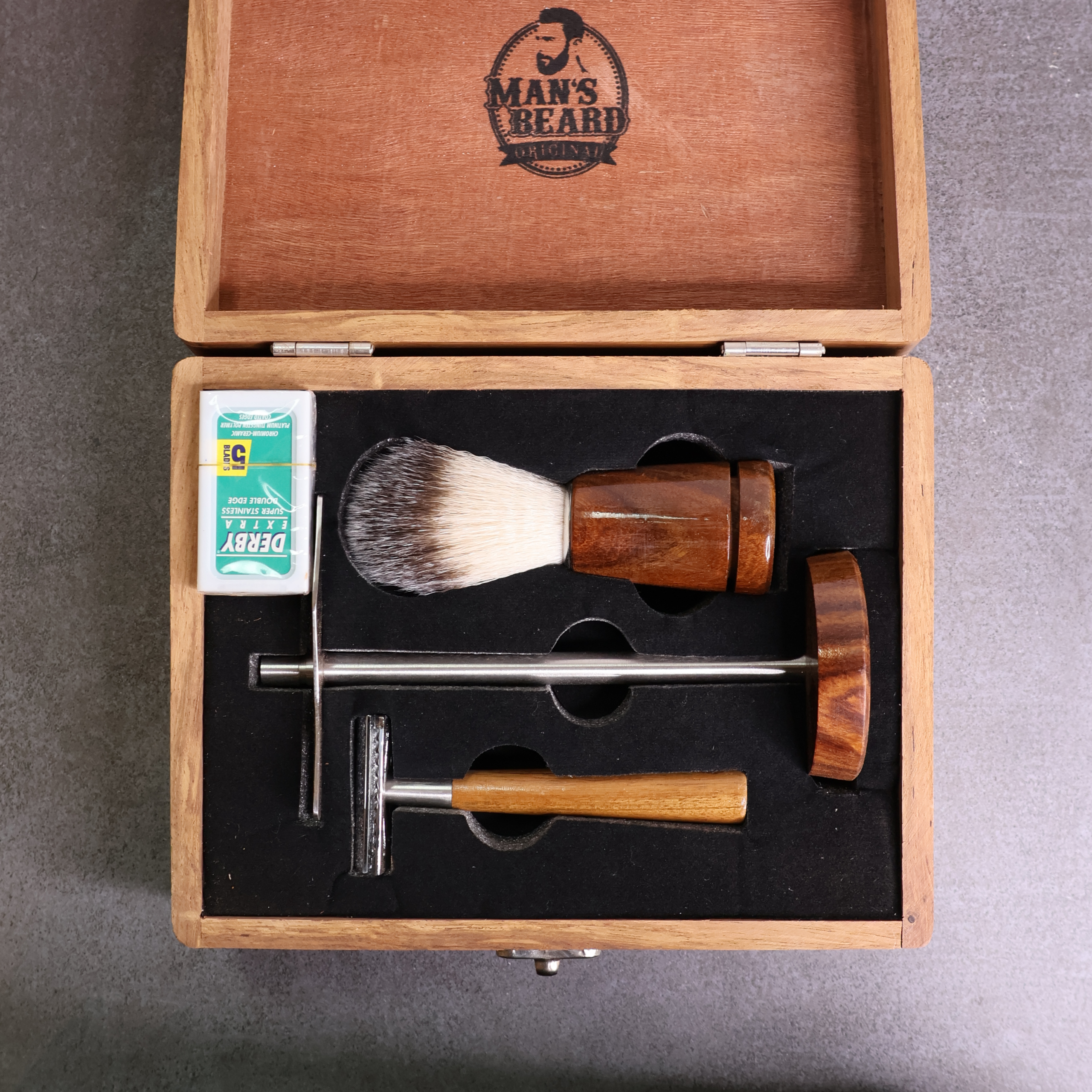 Ce coffret comprend quatre accessoires indispensables pour entretenir votre barbe avec style : un rasoir, un blaireau et un support. Chaque élément est soigneusement sélectionné pour offrir une expérience de rasage traditionnel optimale.
