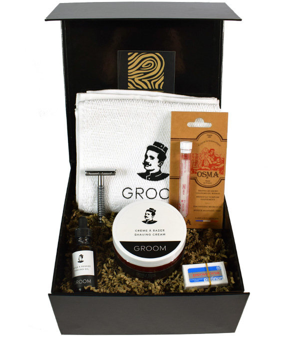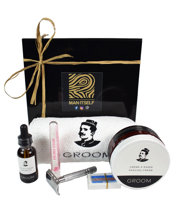 Le coffret contient 1 Rasoir de sécurité 3 pcs et 10 lames + 1 huile de rasage + 1 crème à raser + crayon hémostatique +1 serviette rasage 100% coton