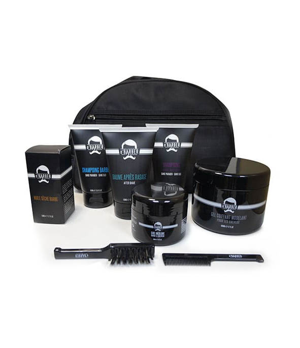 Contenance : 1 trousse complète = 1 shampoing pour cheveux tube 100 ml, 1 shampoing pour barbe tube 100 ml, 1 baume après rasage tube 100 ml, 1 cire incolore pot 100 ml, 1 huile pour la barbe flacon 50 ml, 1 gel cheveux pot 500 ml, 1 kit brosse et peigne barbe